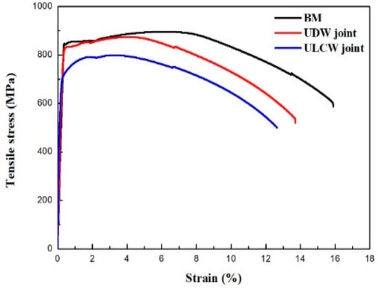 The representative tensile stress-strain plots of the BM, UDW, and ULCW joints of Q690E steel are shown in Figure 10. The yield strength (YS) and ultimate tensile strength (UTS) of the joints and BM are summarized in Table 4. The welded specimens (especially the FZ and HAZ) are inhomogeneous and, hence, the values recorded for the YS and the UTS are non-representative of the sub-zones of the samples []. The BM specimen presents the best tensile properties. However, the tensile properties of the ULCW joint sample are inferior to those of the Q690E BM. The YS and UTS of the BM (843 MPa and 896 MPa, respectively) are higher than those (YS: 831 MPa, UTS: 876 MPa) of the UDW joint. However, the YS: 722 MPa and UTS: 799 MPa of the ULCW joint are ~120 MPa lower and 97 MPa lower, respectively, than those of the BM.