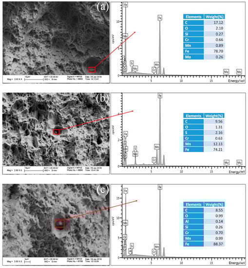 As determined by energy dispersive spectroscopy (EDS), the inclusion particles within (i) BM contain Fe, Cr, Mn, Mo, O, Si, and C (see Figure 11a–c); (ii) the UDW joint contain Fe, Cr, Mn, S, O and C; and (iii) the ULCW joint are rich in Fe, Cr, Mn, Al, Si, O and C.