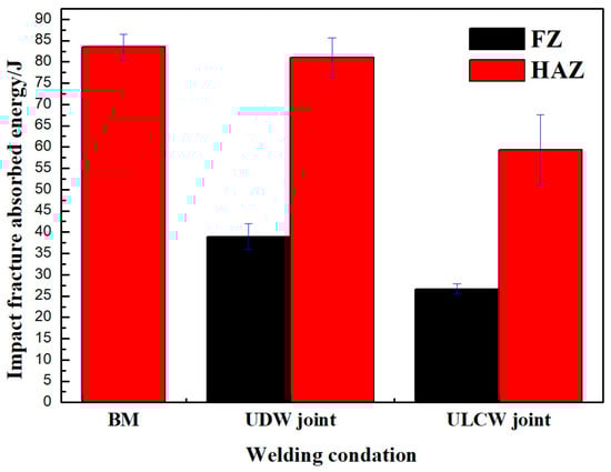 Sub-sized (55.0 × 10.0 × 5.0 mm3) specimens are subjected to Charpy impact testing at a temperature of −40 °C. The original absorbed impact energy of the BM, UDW joint, and ULCW specimens with notches opened at the weld center line and in the HAZ region is shown in Figure 12 and Table 5.