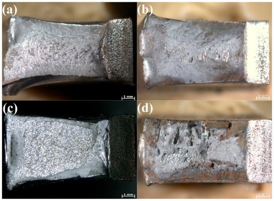 Impact macroscopic fracture morphology of welded joints with two welding methods: (a) HAZ-UDW joint; (b) FZ-UDW joint; (c) HAZ-ULCW joint; (d) FZ-ULCW joint.
