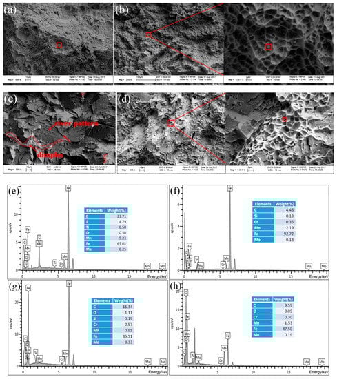 Furthermore, EDS results indicate that the main elements composing the inclusion particles in the (i) HAZ of the UDW joint, (ii) FZ of the UDW joint, (iii) HAZ of the ULCW joint, and (iv) FZ of the ULCW joint are (i) C, S, Ti, Cr, Mn, Mo, Fe (Figure 15e), (ii) C, Si, Cr, Mn, Mo, Fe (Figure 15f), (iii) C, O, Si, Cr, Mn, Mo, Fe (Figure 15g), and (iv) C, O, Cr, Mn, Mo, Fe (Figure 15h).