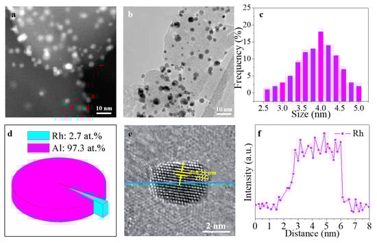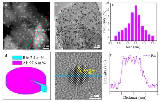 TEM characterization of Rh/γ-Al2O3 catalysts synthesized by IWI: (a) STEM image; (b) TEM image; (c) Rh size distribution; (d) Rh/Al atomic ratio based on the EDX data; (e) HRTEM image; (f) EDX spectrum.