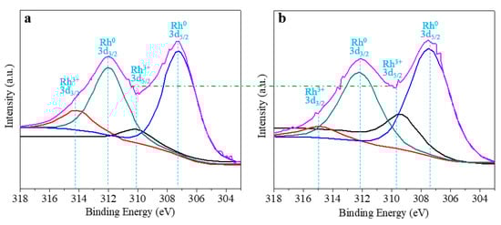 (a) XPS of Rh/γ-Al2O3 catalyst from ALD; (b) XPS of Rh/γ-Al2O3 catalyst from IWI.