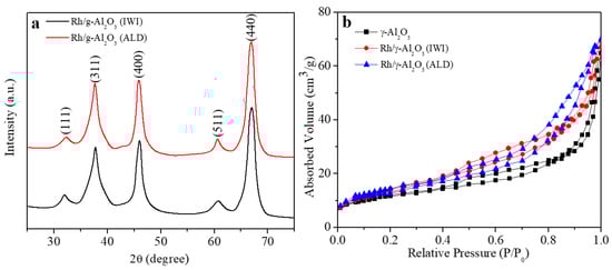 The crystal structure of the catalysts could be determined by X-ray diffraction (XRD). The XRD patterns of both catalysts shown in Figure 5a are in a good agreement with the standard JPCDS card (NO. 10-0425) [], which is attributed to the support of γ-Al2O3. The XRD patterns of Rh nanoparticles are not shown in the two catalysts. This could be because the loaded mass of Rh nanoparticles in both catalysts is lower than the detection limit of XRD, and similar results were reported in many previous reports [,,]. Another possibility for the absence of Rh peaks in the XRD patterns is that, as shown in Figure 2a and Figure 3a, the size of Rh nanoparticles is very small (~2–4 nm). Therefore, their peak broadening is so pronounced that no sufficient diffraction can occur to result in resolved diffraction peaks. As discussed above, the existence of Rh0 has been confirmed by TEM and XPS. The specific surface area is one of the most important parameters for catalysts, as a larger specific surface area could potentially provide more active reaction sites for catalytic reactions. The specific surface area is widely characterized in the laboratory by Brunauer–Emmett–Teller (BET) method. The BET is conducted with the relative pressure range between 0.01 and 1. Before the BET measurement, the catalysts were degassed at 120 °C for 12 h. According to the N2 adsorption and desorption curves in Figure 5b, the specific surface area of γ-Al2O3, Rh/γ-Al2O3 (ALD), and Rh/γ-Al2O3 (IWI) is calculated as 128, 131 and 119 m2/g, respectively. Considering the sample variation, it could be generally concluded that the catalyst preparation process brings little impact on the specific surface area of the catalysts. The catalysts synthesized by ALD and IWI show similar specific surface area. Therefore, the BET surface area is not the key factor for their different catalytic performance.