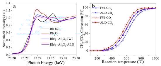 (a) Rh K-edge XANES spectra for Rh foil, Rh2O3, Rh/γ-Al2O3 catalysts; (b) CH4 and CO2 conversion of Rh/γ-Al2O3 catalysts from IWI and ALD between 100–1000 °C.