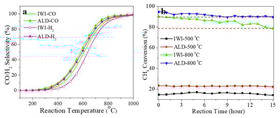 (a) CO and H2 selectivity of Rh/γ-Al2O3 catalysts from IWI and ALD between 100–1000 °C; (b) CH4 conversion of Rh/γ-Al2O3 catalysts from IWI and ALD over 15 h under 500 and 800 °C.