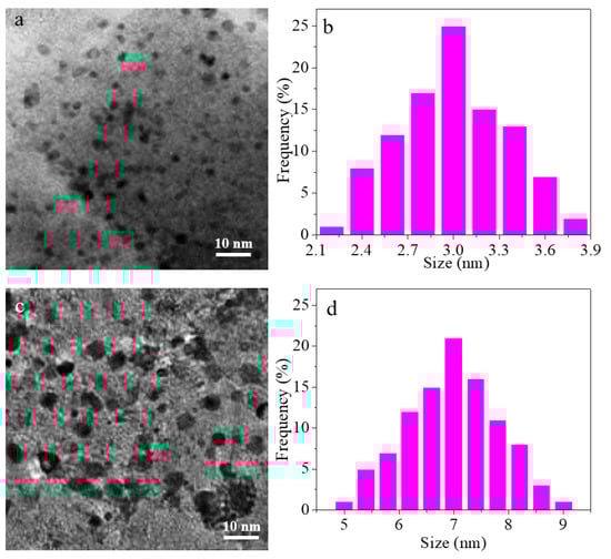 As shown in Figure 7b, the CH4 conversion is decreased in both catalyst under 800 °C for 15 h. To investigate this change, the TEM images of both catalysts after running at 800 °C for 15 h are displayed in Figure 8a,c, respectively, and the corresponding size distribution is shown in Figure 8b,d. It can be seen that the average Rh particle size is increased from 1.8 to 2.8 nm in Rh/γ-Al2O3 catalysts (ALD), while the average size is increased from 4.2 to 7.3 nm in Rh/γ-Al2O3 catalysts (IWI). Therefore, sintering occurs in both catalysts. The EDX investigation on both catalysts did not detect obvious carbon residues in the catalysts, which was consistent with previous research results that indicated that noble metal catalysts are more resistant to carbon formation []. Therefore, the major reason for the decreased CH4 conversion in DRM reaction could be attributed to Rh nanoparticle sintering.