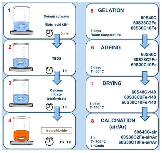 The sol prepared for the synthesis of the control system (60S40C) was ready to undergo gelation; however, an additional step was required for the synthesis of the Fe-containing materials. Specifically, FeCl3 was slowly added to the batch which was stirred for 1 h until complete dissolution of the salt.