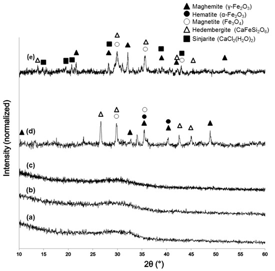 XRD patters of: (a) 60S40C-air; (b) 60S38C2Fe-air; (c) 60S38C2Fe-Ar; (d) 60S30C10Fe-air; and (e) 60S30C10Fe-Ar.