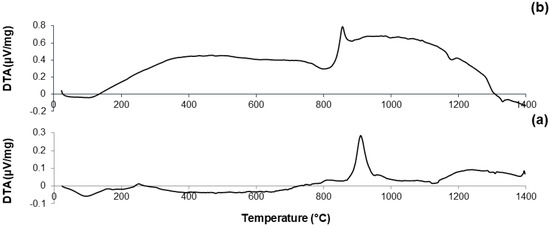 Differential thermal analysis (DTA) was performed on powdered calcined samples (50 mg) by using a DTA 404 PC instrument (Netzsch, Selb, Germany); temperature range was 20–1400 °C with a heating rate of 10 °C/min. The powder was introduced in Al2O3 crucibles provided by the manufacturer; high-purity Al2O3 powder was used as a reference material. Standard calibration procedure and baseline corrections were performed.