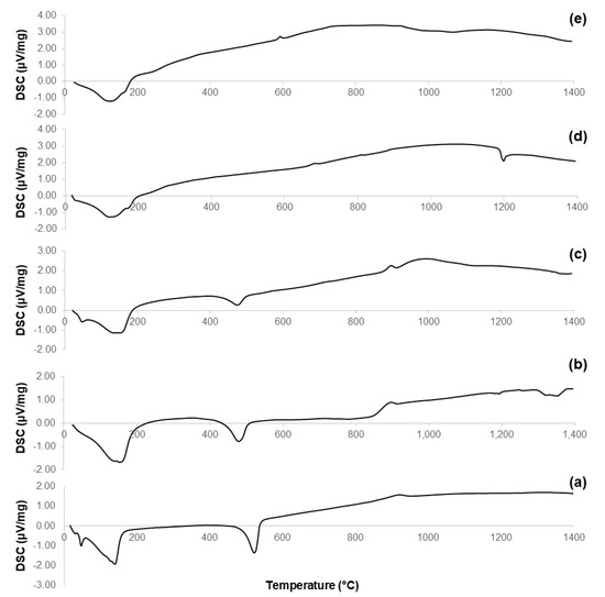 Figure 5 reports the results of DSC analyses performed on the non-calcined materials obtained at Step 7 of the synthesis process (see Figure 1). These thermographs allow a better understanding of the evolution of the crystalline phases that appear in the calcined samples (Figure 2); the characteristic temperatures are collected in Table 3.