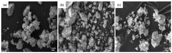 SEM micrographs of: (a) 60S40C-air; (b) 60S38C2Fe-air; and (c) 60S30C10Fe-air powders.