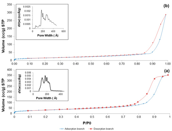 Nitrogen adsorption-esorption isotherms at −196 °C of: (a) 60S40C-air; and (b) 60S38C2Fe-air. Inset in both pictures reports the pore size distribution assessed by NLDFT method.