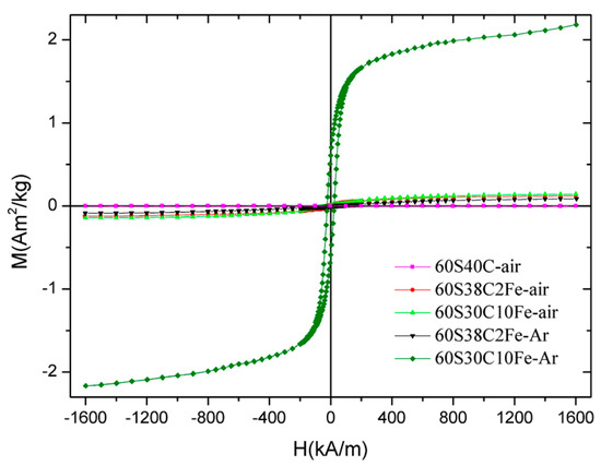 The lower magnetization of 60S30C10Fe-air is due to the predominant presence of hematite (Figure 8d), which is antiferromagnetic [49]. Interestingly, the amorphous 60S38C2Fe materials produce a magnetic response, too, albeit a poor one compared to the other materials. This micromagnetic behavior reflects the presence of long-range (ferri)magnetic interactions among the iron ions that are present in the glassy matrix [50]. In this regard, it has been shown that two types of interactions exist in glassy systems containing Fe2O3 as network modifiers, i.e., dipole-dipole and superexchange-type interactions [51]. A similar weak magnetic response was also reported by Wu et al. [27] for SiO2-CaO-P2O5 mesoporous glass scaffolds doped with 5 mol % of F2O3, but the magnetic parameters were not quantitatively assessed.