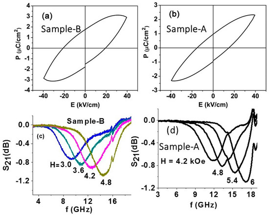 (a) P vs. E for a disc of fibers with NFO core–BTO shell (sample B). (b) Similar data as in (a) for fibers with BTO core–NFO shell (sample A). (c) Scattering matrix parameter S21 versus frequency f profiles showing ferromagnetic resonance (FMR) for a series of bias fields H for a pressed rectangular disc of sample B. (d) Similar FMR profiles for sample A.