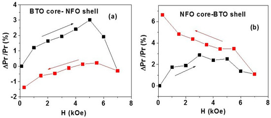(i) H-induced polarization: The strength of direct magneto–electric (DME) effects in disks of annealed, magnetic field-oriented fibers were investigated by measurements of ferroelectric hysteresis under a static magnetic field. Samples A and B for the measurements were made by adding a binder to the fibers, loading onto an alumina die, and exposing them to a static magnetic field of 4 kOe. The oriented fibers were then pressed into a circular disc in the alumina die with a hydraulic press. The disc was placed in the ferroelectric tester. A static magnetic field H was applied parallel to the sample plane. Data on P vs. E as in Figure 3 were obtained for H = 0–7 kOe for both increasing and decreasing H values and the change in the remnant polarization Pr under H was determined. Figure 4 shows the fractional change in Pr: ΔPr/Pr (H = 0) = [Pr(H)-P(H = 0)]/Pr (H = 0) for H = 0–7 kOe. Data in Figure 4a for sample A with BTO core and NFO shell show an initial increase in ΔPr/Pr with H up to 5 kOe and then a rapid decrease to zero for H = 7 kOe. Upon decreasing H from 7 kOe to zero, ΔPr/Pr becomes negative with a maximum value of 1.5% for H = 0. A somewhat different character is seen in Figure 4b for sample B with NFO core and BTO shell. An increase in ΔPr/Pr is observed as H increases from 0 to 7 kOe. With a subsequent decrease in H back to zero, ΔPr/Pr shows a further increase to a maximum value of ~7% for H = 0. Thus, it is evident from the results in Figure 4 that a strong strain-mediated ME coupling is present in the core-shell fibers and that the nature of coupling depends on the ferroic phases in the core and the shell. The data in Figure 4 compare favorably with H-induced change in polarization reported for core–shell fibers of NFO and PZT [34].