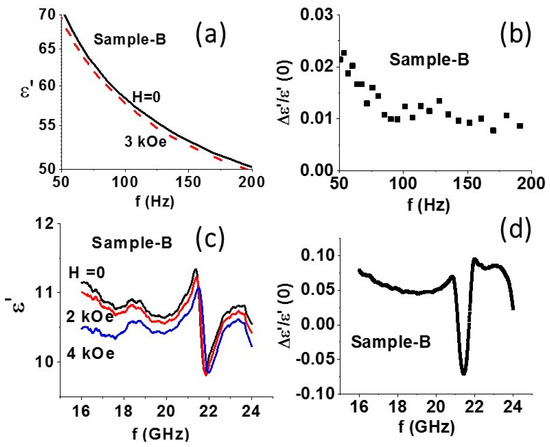 (ii) Magneto–dielectric effect: Next, we consider the characterization of ME coupling by H-induced variation in the permittivity at 50–200 Hz and at 16–24 GHz. Data on ε vs. f at low frequencies were obtained from measurements of capacitance C vs. f on disc samples pressed in a magnetic field. Figure 5a shows frequency dependence of the real part of the permittivity ε′ for sample B. For H = 0, a decrease in ε′ with increasing f is measured. With the application of H = 3 kOe, ε′ decreases and the fraction decrease in ε′ shown in Figure 5b ranges from 1% to 2.3%.