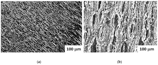 SEM micrograph for core–shell fibers of sample A assembled in (a) a uniform magnetic field and (b) in a non-uniform field produced by a permanent magnet.