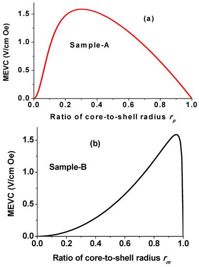Estimates of the low-frequency ME voltage coefficient as a function of the ratio of core-to-shell radius for the fibers of sample A are shown in Figure 8a. For fibers with BTO core and NFO shell, estimated MEVC in Figure 8a shows a maximum value of 1.6 V/cm Oe for rp = 0.33. Similar estimates of MEVC vs. rm for sample B are shown in Figure 8b and the maximum ME response is predicted for rm = 0.94. Theoretical values of MEVC in Figure 8 are much higher than the measured values in Figure 7. In the present case for fibers of sample A with rp = 0.5, the estimated MEVC ~1.3 V/cm Oe and is at least three orders of magnitude higher than the measured value in Figure 7a. In the present case for fibers of sample B with rm = 0.3, one expects MEVC of 0.2 V/cm Oe and is two orders of magnitude higher than the measured value in Figure 7b.
