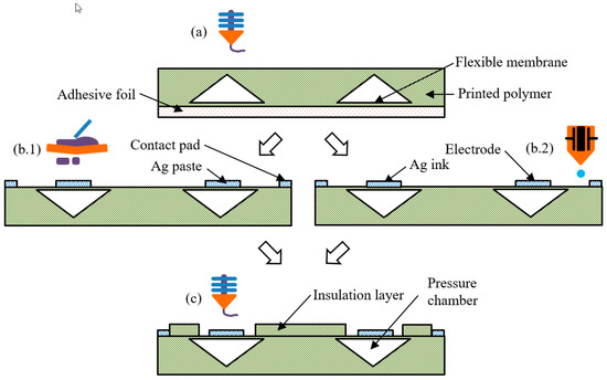 The module is 4 mm high, 40 mm long and 22 mm wide. The setting of the distance between the nozzle and the build plate is the main determinant of the membrane thickness, and was set manually before each print by visual inspection when printing the test structures surrounding the actual model. An arithmetic average surface roughness of about Ra = 1.5 µm was achieved by printing on an adhesive foil. The conical shape of the pressure chamber is essential for successful 3D printing without supporting structures. The printer closes the chamber layer by layer, just a little at a time, until it fully closes on top. In the next step, (b), the printing of the electrodes was accomplished by using one of two technologies: screen printing and inkjet printing. For screen printing (Figure 2b.1), polymeric silver paste C5029 from DuPont de Nemours GmbH (Hamm, Germany) and an MPM SPT printer (ITW EAE, Glenview, IL, USA ) was used. The paste was cured for 60 min at 60 °C in a hot air oven according the manufacturer’s process description. The layer height was, on average, 23.1 µm, and the average surface roughness was Ra = 4.6 µm. For inkjet printing (Figure 2b.2), NPS-JL silver ink from Harima Chemicals (Tokyo, Kantō, Japan) and a Pixdro LP50 printer (Eindhoven, The Netherlands) with a Dimatix Cartridge system were used. The paste was cured for 60 min at 120 °C in a hot air oven, and has been proven suitable for flexible application in the literature [19]. Two layers were printed, with a resulting average layer height of 1.9 µm and Ra = 0.7 µm. The area of the electrodes was 12.6 mm2, and two pads were connected to produce a redundant contact. The last step (Figure 2c) was again FDM printing of the insulation layer with a thickness of 0.7 µm using PolyFlex™ on top of the electrodes. Here, the nozzle distance was set not to damage the previously printed electrodes. The connection pads were left uncovered by this layer in order for the electrodes to be able to contact the copper wires, using conductive adhesive H20E from Epoxy Technology Inc. (Billerica, MA, USA). For this first state, the connections were isolated using polymeric tape.