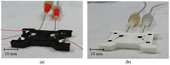 The electrode module was characterized regarding its suitability for potential long-term skin contact applications. In doing so, both inkjet and screen printing will be considered as possible methods for electrode printing. For practical reasons, and for better illustration, the module with screen-printed electrodes was printed with black filament (Figure 3a), and the inkjet-printed module with white filament (Figure 3b).