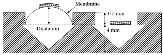 The dilatation of the membrane depends on the pressure applied to the chamber, the thickness of the membrane, and its material properties, as well as the influence of the conductive layer on it. The latter has not been taken into account in this first feasibility study. Due to the manufacturing process, the membrane thickness is subject to variation. To access the pressure chambers of the module from the outside, syringe needles have been used. The connection seals are airtight, and pressure can be applied through syringes of 50 mL volume. The leakage was determined to be 2.4% over a period of time of 60 s at a pressure of 75 kPa. In Figure 4a, the schematic cross-section shows a dilated membrane if the left chamber is pressured. The dilatation was measured using a laser profilometer µscan from NanoFocus AG (Oberhausen, Germany) with the chromatic sensor CLA. The pressure was measured with an analog manometer from Festo AG (Esslingen am Neckar, Germany) with graduation of 100 mbar and a digital DP200 from Mecotec (Gembloux, Belgium). After the experiment, the membrane thicknesses were determined by cutting them out and measuring with µscan. Furthermore, concerning the first reliability forecast, 5 modules with (319 ± 30) µm membrane thickness were tested with 300 pressure and release cycles with a maximum pressure of 100 kPa. At the beginning, and after every 100 cycles, the dilatation was measured at peak pressure using the laser profilometer µscan. The pressure higher than the intended operation pressure was chosen for further skin contact measurements.