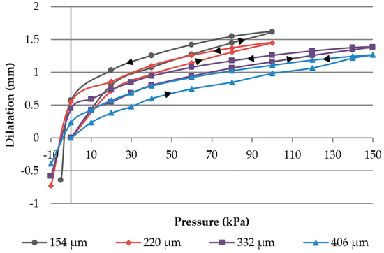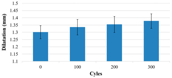 In Figure 7, the dilatation in the z-direction at a pressure of 100 kPa is shown as a function of pressure and release cycles. With increasing cycle numbers, the dilatation also rose. Over 300 cycles, the dilatation rose approximately 5.9%.
