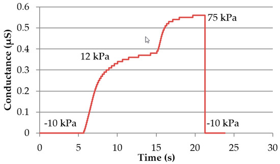 The electrical performance of the electrode modules was characterized using EDA measurement (ADInstruments, Sydney, Australia). In Figure 8, the pressure-dependent conductance during on-skin measurements is shown. At a pressure of −10 kPa, no conductance was measured, due to indrawn electrodes. At 12 kPa of pressure, the electrode-skin contact was established, and 75 kPa was the maximum achievable pressure with this set up. Increasing the pressure within the module increases the electrode area, which is pressed onto the skin. In contrast to the soft skin, when pressing the electrodes on rigid surfaces, the pressure dependency was not noticeable. Because of the pressure, the electrode area doesn’t cling to the rigid surface, and hence the contact area doesn’t rise.
