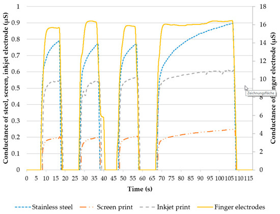 Figure 9 shows the EDA measurements for each type of electrode, averaged over all 5 subjects. The finger electrode showed highest conductivity, because fingers and palms contain a higher density of sweat glands compared to the forearm, and the electrode area was the largest. Taking into account that the stainless steel electrode, with the second-largest electrode area, showed the second-highest conductivity, the achieved results are reasonable. The electrode modules both showed lower conductivity in comparison, with the screen-printed electrode being the lowest. Table 1 shows the mean value, standard deviation and variation coefficient for each type of electrode over all four conduction phases. While the absolute amplitude of the finger electrodes was about 10 times higher than the other electrodes, the signal course was qualitatively similar in all 4 types of electrodes. Variation coefficients showed higher variations in the conduction phase for screen-printed, inkjet-printed, and stainless steel electrodes compared to finger electrodes. The longer the conduction, the more the conductance for screen-printed, inkjet-printed and stainless steel electrodes rises (conductance in phase 4 is 11%–23% higher than in phase 1–3), whereas this phenomenon is not observable for the finger electrodes (3%).