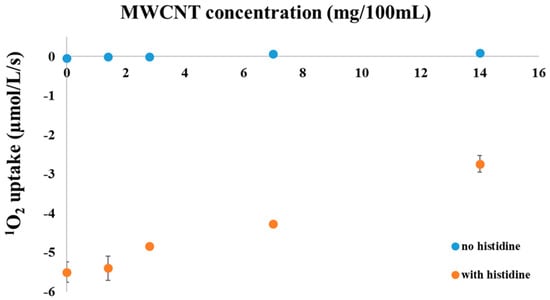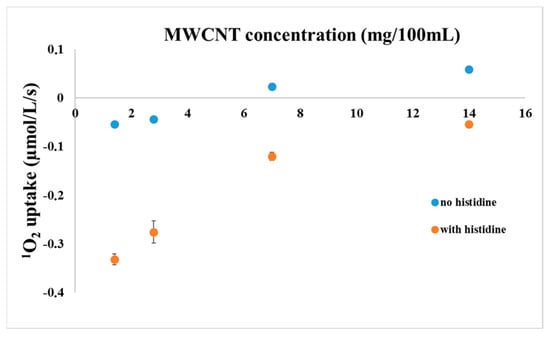 As a control experiment, oxygen uptake of mixed solutions of RC and MWCNT-COOH were measured with the Clark electrode as a function of MWCNT concentration in the presence or absence of histidine (Figure 3). As it was expected, due to the sensitization by the RC in the presence of histidine, an oxygen uptake was measured in a concentration dependent manner. However, in the absence of histidine, the yield of trapped 1O2 was reduced considerably. The oxygen uptake measured in the absence of histidine is probably due to the chemical reaction of 1O2 with MWCNT-COOH, so chemical quenching is one of the possible reaction mechanisms between these two materials. Note, that 1O2 interacts in the same way with the Clark electrode as normal O2, i.e., 1O2 production in itself does not change the level of dissolved O2.