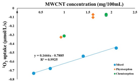 After examining the effect of MWCNT on the 1O2 concentration in the model system in which methylene blue was used as a sensitizer, we were interested in the characteristics of the 1O2 generation by the RC/MWCNT-COOH system. In this composite, reaction center purified from Rb. sphaeroides R-26, a carotenoid-less strain of purple bacteria, acts as 1O2 sensitizer, and MWCNT-COOH might act as a quencher either by physical or by chemical mechanisms. First, 1 µM RC was mixed with MWCNT-COOH in different concentrations. Second, RC was bound to MWCNT-COOH by physical sorption and third, by EDC/NHS chemical crosslinking methodology. In both cases, sorption was done in two different RC-MWCNT ratios. Light induced 1O2 uptake was measured for all the three suspensions (Figure 2).