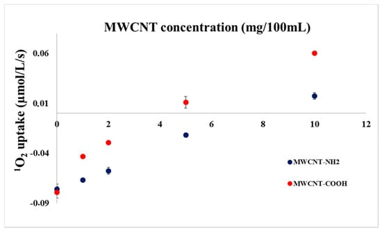 The reaction of carbon nanotubes with singlet oxygen is a complex mechanism. Without MWCNT and histidine only a small oxygen uptake (ca. 0.08 µM1O2/L/s) was measured in both experiments due to the presence of reactive functional groups. The effect decreases gradually when MWCNT is added either functionalized with carboxyl—or with amine groups. The deactivation seems to be more pronounced when carboxyl-functionalized MWCNT is added. This result is in line with the results of Boldog et al. [] who also found enhanced deactivation with MWCNT-COOH as compared with MWCNT-NH2. However, these authors used specific dye, DPBF, for the detection of singlet oxygen. Positive turn in the oxygen concentration change was found for both samples, however, at a larger concentration for MWCNT-COOH. This result indicates that because of the highly oxidising environment during the preparation of MWCNT-COOH, considerable amount of oxygenic chemical groups is situated on the MWCNT-COOH surface. These oxygenic chemical groups can facilitate the release of oxygen after contacting reactive singlet oxygen an in this case, positive parallel shifts can be assumed, caused by the O2 elimination from MWCNTs.