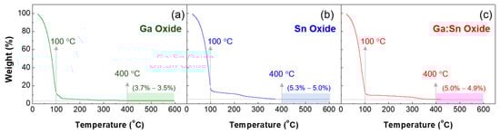 TGA (thermogravimetric analyzer) characteristic curves of the prepared sols: (a) the Ga oxide and (b) Sn oxide precursor solutions and (c) the mixture of Ga oxide and Sn oxide precursor solutions.