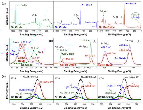 (a) XPS (X-ray photoemission spectroscopy) survey peaks of solution-processed Ga oxide, Sn oxide, and Ga:Sn oxide films; High-resolution XPS spectra of (b) Ga 3d and Sn 4d orbitals; (c) Ga 2p orbitals; and (d) Sn 3d orbitals; (e) O 1s XPS spectra in the Ga oxide, Sn oxide, and Ga:Sn oxide films.