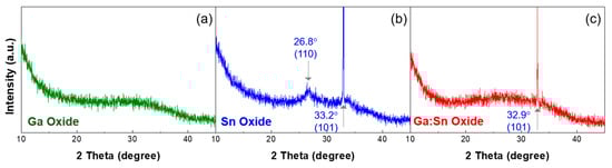 XRD (X-ray diffraction) patterns of the (a) Ga oxide; (b) Sn oxide; and (c) Ga:Sn oxide films, respectively.