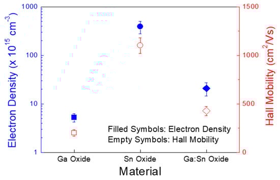 Electron concentrations and Hall mobilities of the Ga oxide, Sn oxide, and Ga:Sn oxide films.