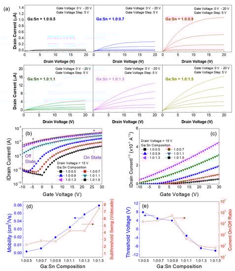 Based on the results shown in Figure 6, the weight ratios of the Ga oxide and Sn oxide precursor sols were varied to investigate the effect of the composition ratio of Ga to Sn on the performance of Ga:Sn oxide TFTs. The molarity of each precursor solution was 0.5 M, whereas the weight ratios of the Ga oxide and Sn oxide precursor sols were changed (Ga:Sn composition = 1.0:0.5, 0.7, 0.9, 1.1, and 1.5). From the output characteristics shown in Figure 7a, the TFTs having different Ga:Sn compositions exhibit n-channel enhancement operation with pinch-off and saturation characteristics of the drain current. In particular, the drain current increases as Sn increases in the Ga:Sn oxide film. Figure 7b,c show the transfer characteristics of the fabricated Ga:Sn oxide TFTs. It can be clearly observed that, owing to the electrical properties of Sn, the drain currents in both the off-state and on-state regions increase as Sn increases in the Ga:Sn oxide film. Important TFT parameters extracted from the transfer characteristics are summarized in Figure 7d,e. As the Sn increased, the field-effect mobility increased and the threshold voltage decreased. These enhancements can be ascribed to an increase in electron concentration in the Ga:Sn oxide films as well as the electrical properties of Sn. Nevertheless, the subthreshold swing increased and the current on/off ratio decreased, which was caused from an increase in the drain current in the off-state region, as indicated in Figure 7b. These results demonstrate that the performance of the solution-processed Ga oxide TFTs can be optimized by substituting Ga with Sn. In this study, the optimal composition ratio of Ga:Sn in the solution-processed Ga:Sn oxide semiconductor is suggested to be 1.0:0.9 by taking into account the switching and amplification functions of typical TFTs.