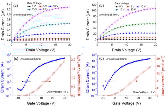 Output characteristics of the Ga:Sn oxide TFTs fabricated at the annealing temperature of (a) 500 °C and (b) 900 °C. Transfer characteristics of the TFTs fabricated at the annealing temperature of (a) 500 °C and (b) 900 °C.