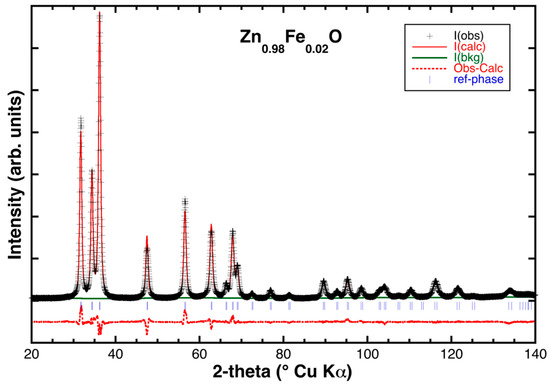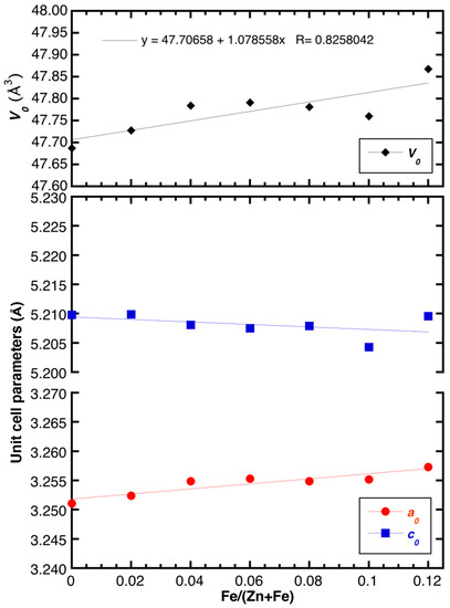 - Kumar, S.; Mukherjee, S.; Singh, R.K.; Chatterjee, S.; Ghosh, A.K. Structural and optical properties of sol-gel derived nanocrystalline Fe-doped ZnO. J. Appl. Phys. 2011, 110, 103508–103516. [Google Scholar] [CrossRef]