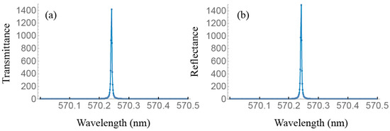 Transmittance (a) and reflectance (b) versus wavelength for the lasing mode of the lowest threshold gain for the PLAL10PL sample; (c,d) are the transmittance and reflectance for the non-diffracting eigenstate under the same gain conditions.