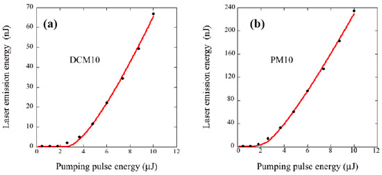 Laser emission energy as a function of pumping excitation energy for the different samples studied (a–f). Continuous lines are fits to Equation (14).