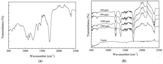 The ATR FT-IR method was utilized to evaluate the chemical properties of the protective film deposited on the steel surface where the main components are organic compounds. Figure 2a shows the ATR FT-IR results of the as-prepared APL-EAE glue. The peaks at 2362 cm−1 and 2343 cm−1, 1715 cm−1, 1520 cm−1 and 1233 cm−1 are assigned to the O–C=O groups, the C=O bond, and the aromatic ring, respectively. Besides, the peaks at 1375 cm−1, 1084 cm−1 and 1028 cm−1 are related to, respectively, the C−H bending mode in methyl group, the asymmetric stretching mode of C–O−C, and the stretching mode of C–N. The bands below 1000 cm−1 indicate to the aliphatic and aromatic C−H groups [30,31,32]. Figure 2b shows the ATR FT-IR spectra of the samples immersed in the ethanol fuel blend environment containing various inhibitor concentrations. It expresses the existence of the absorption bands of the O–C=O group (at 2362 cm−1 and 2338 cm−1), the C=O (at 1737 cm−1), the C−H (at 1366 cm−1), the aromatic ring (at about 1510 cm−1 and 1219 cm−1), the aliphatic and aromatic C–H group (below 1000 cm−1). These results also recorded no peaks of rusting products or other organic compounds in the samples without inhibitor while the intensity of these peaks increases with the increase of APL-EAE concentration. In conclusion, the ATR FR-IR spectra confirm the formation of an organic layer on the samples immersed in APL-EAE.