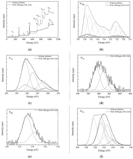 The significantly higher peak of C1s as well as two new N1s and P2p peaks (Figure 3d,e, respectively) in the inhibited system may be contributed by APL-EAE. Besides, the O1s peak in Figure 3f also demonstrates the signals, indicating the products of oxide, hydroxyl, water on the steel surface, respectively, at 529.7 eV, 531.1 eV and 532.3 eV, 533.7 eV and 533.9 eV in the uninhibited system; and at 531.3 eV, 532.6 eV, 534.2 eV in inhibited system. The shifted peaks suggest the change in chemical bonding of oxygen, from iron oxide states to organic bonding states in APL-EAE. The XPS data, in conclusion, confirm that the film formation via the adsorption of APL-EAE on the sample surface by the combination of steel produced the complex product of APL-EAE and iron, covering the sample surface and preventing the attack of corrosion agents and the dissolution of steel.