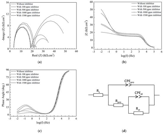 Figure 4a shows the Nyquist plot of samples with different APL-EAE concentrations (0, 100, 500, 1000, and 1500 ppm); there are two semicircles appearing in the Nyquist plot. In addition, the two Bode plots, respectively, total impedance vs. frequencies (Figure 4b) and phase angle vs. frequencies (Figure 4c), show a phase that has low impedance, high phase angle in the range of 103–105 Hz; as well as a second phase that has high impedance, low phase angle in the range of 10−2–101 Hz. It can be concluded that there are two phases existing in the deposited layer, representing the layer of the inhibitor and the interaction between that layer and the substrate surface. Consequently, the circuit model as shown in Figure 4d is proposed to fit the Nyquist plot, while Rs is the solution resistance, CPEpro is the capacitance of the deposited layer (rust layer in uninhibited system and inhibitor layer in inhibited one), Rpro is the resistance of the pores of the deposited coating, CPEdl and Rct are the capacitance of the double layer and the resistance of the charge transfer between the deposited layer and the metal substrate, respectively. Nyquist plot fitting data for APL-EAE-containing-samples were extrapolated using the equivalent circuit as described in Figure 4d. All results have extreme low relative error (χ2 below 0.2%), indicating good fitting quality. The first semicircle in Figure 4a indicates a characteristic of the protective layer of the uninhibited system and inhibited system containing various concentrations of APL-EAE. Rpro values of the first semicircle dramatically increase from 0 ppm to 100 ppm APL-EAE (from 14.95 kΩ to 18.14 kΩ, specifically) due to the significant mixture of rusting product in combination with the discontinuous inhibiting layer. However, this mixture was unstable because of poor properties of the contact layer, which is recorded in the second semicircle. When the APL-EAE concentrations varied from 500 ppm to 1500 ppm, rusting products were significantly inhibited, thus, the deposited film was mostly covered by the layer of the inhibitor (APL-EAE), which was more stable than the previous mixture (Rpro ranges from 21.74 kΩ to 44.18 kΩ). Rpro values are significantly increased in inhibited system containing inhibitor concentrations ranging from 500 ppm to 1500 ppm (18.14, 44.18, 26.51 kΩ, respectively), demonstrating the formation procedure of a stable and continuous layer that prevented the dissolution of steel by adherently depositing and canceling out the conduction paths inside the inhibitor layer. In addition, the second semicircle in Figure 4a maps to the presence of the interaction between the deposited layer and the metal substrate, showing the growth of the impedance values with the increasing of corrosion inhibitor concentration (Rct raises from 5.86 kΩ to 18.14 kΩ), but there is the decrease in case of 1500 ppm APL-EAE (Rct drops from 18.14 kΩ to 17.48 kΩ).