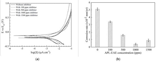 The corrosion behaviors of the samples then were evaluated by PD measurement. From the measured PD data, this result can infer some parameters such as polarization resistance, corrosion rate, and inhibition efficiency. Figure 5 displays the potentiodynamic curves of steel in ethanol fuel blend medium in the sample without inhibitor (uninhibited system) and with different APL-EAE concentration (inhibited systems). Calculated parameters from Tafel extrapolation of PD measurement are described in Table 4. icorr value significantly decreases at higher inhibited system (from 2.17 µA/cm2 of the sample without inhibitor to 0.17 µA/cm2 of the sample with 1000 ppm APL-EAE), associated with the mitigation of corrosion reactions by the action of APL-EAE inhibitor. Also, the Ecorr becomes nobler, and current density of cathode curves decreases with increasing corrosion inhibitor addition, indicating that APL-EAE primarily acts as a mixed-type leaning towards the anodic inhibition process. The polarization resistance, as well as the corrosion rate, were calculated following the corrosion current density following Equations (1) [35] and (2) [36], and the results are given in Table 3 and Figure 5b, respectively.