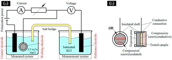 The sealed and insulated fixture for electrochemical test. (a) The schematic of three-electrode system; (b) the schematic of working electrode [].