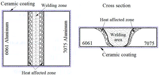 The 6061 and 7075 dissimilar aluminum alloys were successfully friction stir welded, as shown in Figure 2a,b. Overall, plasma electrolytic oxidation was applied to surface the to protect the welded parts, and the welded parts were integrally wrapped by a ceramic coating with 10 min overall plasma electrolytic oxidation treatment, as shown in Figure 2c,d. In other words, the ceramic coating grew on all areas contacted with the electrolyte, including 7075, 6061 and the welding joints surface. Thereby, an integral and sealed protective layer formed. As a result, the insulated ceramic coating isolates the 6061–7075 welded part from corrosion media, and broke the electronic circuit of corrosion to improve the corrosion resistance of welded part []. The schematic diagram of overall ceramic coating on the surface of 6061–7075 welded parts is presented in Figure 3.