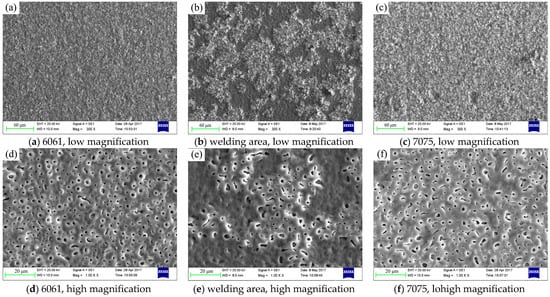 Figure 5 shows the morphology of ceramic coating on the surface of 6061, 7075 and welding area. Considerable amounts of micropores were randomly distributed on the surface of the coatings []. Therefore, the morphology of the coating was relatively rough. Micropores formed when the molten oxides and gas bubbles ejected from discharge channels [,]. Obviously, the morphology of the ceramic coating on the surface of welding area was different from the coatings on base metals (6061, 7075), as shown in Figure 5a–c. Many island-shaped and volcano-like objects grew on the surface of welding area. Conversely, the coating on 6061 and 7075 surfaces was much more consistent and flat. The observation from high magnification in Figure 5d–f showed that the coatings on 6061 and 7075 had a similar porous structure, and the diameter of the pores was about 0.5–2 μm. However, the island-shaped and porous objects on the coating of welding area seemed to grow on a dense basal layer, and it had a similar porous structure as the coating on 6061/7075, which can be seen in Figure 5d–f. In other words, the ceramic coating on welding area consisted of a porous layer and a dense basal layer from the top to the bottom.