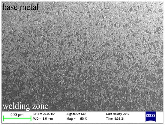 Corrosion potential difference exists among different kinds of metals, and the conductive contact of dissimilar metals will cause serious galvanic corrosion []. As a result, the corrosion rate of the metal with lower corrosion potential (act as anode) increased and the metal with higher corrosion potential (act as cathode) was the opposite []. Accordingly, it would significantly reduce the service life of the dissimilar metal welded/connected parts. The overall micro arc oxidation could improve the corrosion resistance of each material as well as reduce the corrosion potential difference between different metals i [,]. Furthermore, the insulated integral ceramic coating isolated the 6061–7075 welded parts from corrosion media and broke the electronic circuit of corrosion, which meant the generation and extension of the corrosion were curbed effectively and it was the key technology to reduce the galvanic corrosion for lightweight alloys [].