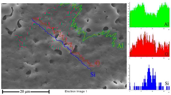Besides, the number of randomly distributed island-shaped porous layers gradually decreased along the 6061/7075 aluminum area to welding area, as shown in Figure 6. To further explore the growth mechanism differences between the ceramic coating on base metals and welding area, EDS linear scan was used to analyze the island-shaped porous layer and the dense basal layer. The results in Figure 7 showed that the intensity of silicon (Si) element rose in the island-shaped porous layer, whereas the intensity of aluminum (Al) decreased.